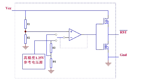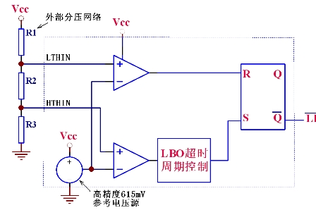 IC內含一個高精度的615mV基準電壓源、兩個比較器、一個RS觸發器和其它一些邏輯電路,其大致功能是:VCC電壓或其它待檢測電壓通過R1-R3組成的分壓網絡接在IC的LTHIN /HTHIN檢測引腳,當待測電壓下降導致LTHIN引腳低於615mV時,輸出腳LBO\輸出低電平,而如果待測電壓上升導致HTHIN引腳高於615 mV時,經過內部邏輯判斷和簡單延時後,輸出腳LBO\輸出高電平。