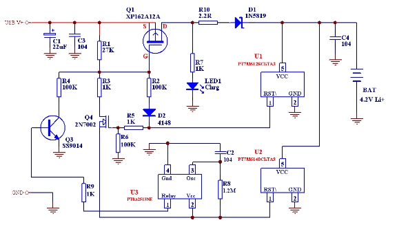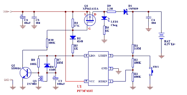 PT7M7433T是上海百利通公司最新設計的極高精度的一係列電壓檢測器的其中一款,其檢測精度在0-Vcc (5.5V)範圍內小於1mV,而且其批量IC的檢測值偏差<±2.5%,這樣完全保證了批量產品的性能一致性和極高的總體性能,我們利用其配合少量外部電路即可組成相當簡單的鋰電池充電線路。