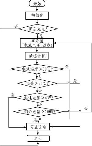采用充電限壓,電池溫升檢測策略,如蓄電池電36 V,充電截止電壓42.5-43 V,充電截止溫度80℃,充電截止溫升30℃。不過絕大部分時間蓄電池基本處於欠充狀態。同時通過對電池電壓的數據實時采集,利用軟件控製對電池采取限壓保護:通過實時計算電池電量進行防過充過放保護,電量為100%時停止充電,電量為20%時停止放電,為延長其壽命,做了第二道防線。圖1 為蓄電池過充保護流程圖。