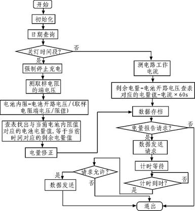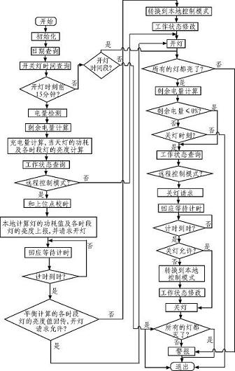 進jin行xing太tai陽yang能neng路lu燈deng電dian池chi板ban電dian流liu檢jian測ce,蓄xu電dian池chi電dian壓ya檢jian測ce,蓄xu電dian池chi電dian量liang監jian測ce,以yi及ji環huan境jing溫wen度du的de檢jian測ce,采cai用yong光guang開kai時shi關guan,並bing實shi時shi上shang傳chuan工gong作zuo環huan境jing及ji狀zhuang態tai數shu據ju,預yu警jing故gu障zhang,保bao證zheng係xi統tong的de可ke靠kao性xing。圖tu2為太陽能路燈的開、關控製流程網。