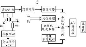給電池施加一個固定頻率和固定電流(日前一般使用l kHz頻率、50 mA小電沆),然後對其電壓進行采樣,經過整流、濾波等一係列處理後通過運放電路計算出該電池的內阻值。圖4為在線測量剩餘電量硬件框圖。