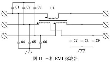 在電源電纜上的幹擾具有共模和差模電流分量,在IGBT逆變焊機中共模幹擾是主要治理對象,圖11是一種共模、差模兼顧的三相EMI濾波器。C4~C9、L1主要用於共模幹擾的濾出,L1的漏抗和C1~3用於差模幹擾的濾出。