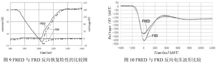 例如FRED就較一般的FRD在恢複時間、反向電壓等方麵有一定的優勢。圖9是一種國產FRED與進口FRD反向恢複特性的比較,圖10是國產FRED與進口FRD反向電壓波形比較。