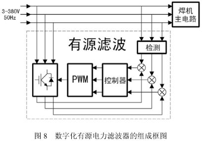 有源濾波器原理如圖 8 所示。通過檢測電路對負載端(焊機主電路)的電壓、電流進行檢測,然後送入控製電路進行計算分析,輸出相應的脈衝驅動 IGBT,chanshengyufuzaidianliuzhongdexiebodianliudaxiaoxiangdengfangxiangxiangfandedianliu,congerdadaobuchangfuzaidianliuzhongdexiebofenlianghewugonggonglvdemude。nibianqigongzuoshisuoxuyaodenengliangyouchunengdianlugonggei,gaichunengdianlushitongguonibianqizhongdegege IGBT 的反並聯二極管進行充電,同時又在 IGBT 開通時輸出能量,使諧波電流分量和無功功率得到補償。這樣,電網的輸入電流可實現為正弦波形。 有源濾波器動態響應迅速,濾除諧波可達到 95%以上,補償無功細致。但有源濾波器由於電路複雜,材料成本高,運行可靠性也不及無源濾波電路,對市場價格競爭異常激烈的 ZX7、NB 係列逆變焊機而言不太適用,但對需要作精細控製的數字化焊機而言,可能有源濾波才是其最佳選擇。