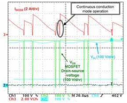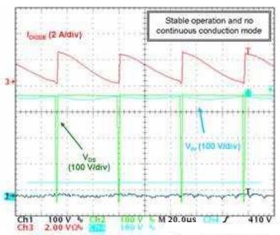 圖4顯示出現不穩定性問題時高輸入線路(正弦波頂端,此處Vin約為380V)下的VAUX電壓。我們可以看到MOSFET關閉時,VAUX電壓輕微躍升至高於ZCD閾值。由於其大紋波的緣故,在退磁相位期間,VAUX電壓首先增加,然後下降。由於在某些開關周期的末段VAUX接近ZCD閾值,這VAUX電壓下降導致零電壓比較器在電感磁芯完全複位前就翻轉(trip)。圖5證實了這一論斷。有時,升壓二極管仍在導電時,PFC段開始新的周期。這個現象主要導致線路電流失真(見紅色跡線)、功率因數退化,並可能有一些頻率處在人耳可聽到的噪聲。