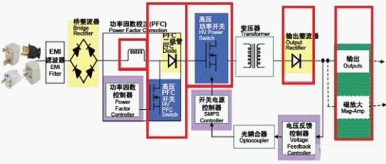 在一個電源設計中,能效規範對電路段的挑戰主要體現在PFC能效、主轉換器能效和次級能效幾個方麵。要提高這幾個方麵的能效,就必須改善如圖1所示電路紅色框中的元件性能。以下將介紹改善電路段能效的幾種方法。