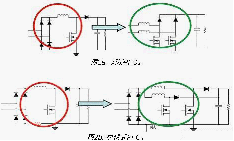 改善PFC能效的目標是為了實現功率因數校正短的效率達到96%以上。采用無橋PFC(圖2a)可以減少橋損耗,采用交錯式PFC(圖2b)可以滿足較高功率應用的要求,以提升PFC能效。此外,還可以利用IC技術減少開關損耗,並利用更優化的拓撲結構來減少EMI濾波器損耗。