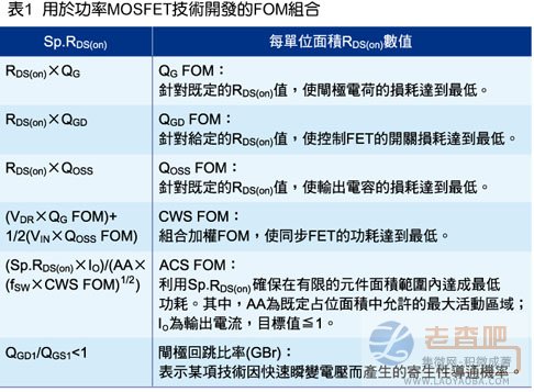 對於控製FET方麵而言,由於現代功率MOSFET的高增益特性,其電流升降時間由電路和源極電感決定,因此其餘能耗則由電壓升降時間決定,而這些時間則取決於QGD FOM。因此,單獨為控製FET定義一個FOM組合並無實際益處。雖然CWS FOM可達成最佳化以應用於同步FET,也可用於判定COSS、CGD和CGS之間由於裝置結構所產生的不利影響,但是要注意的是,由於現代元件的QGD相當低,因此,QGD不再是控製FET中功耗的主要因素。另外,由於控製FET的體積相對較小,基本上麵積限製晶片尺寸的問題已不複存在,因此,采用麵積受到限製的FOM亦無法增加優勢。