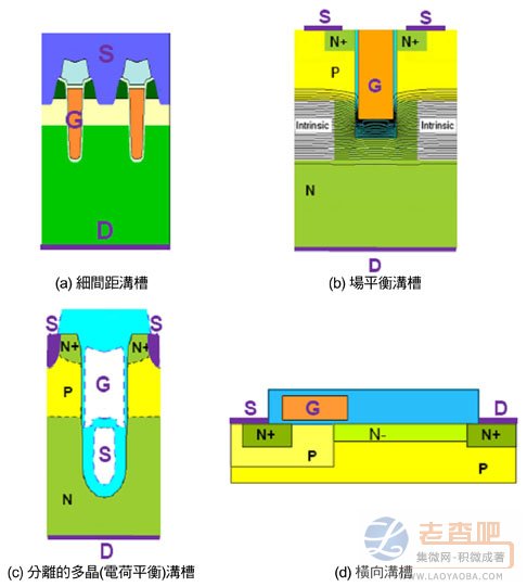 圖1標示出目前常用的多種功率MOSFET元件結構。圖1a中所示的高密度溝槽結構采用較低的Sp.RDS(on),但QG和QGD較高,因為此兩個參數與單元密度成正比。此種結構通常用於開關損耗較無重要性的應用中(如電池保護)。可透過加大單元間距、於溝槽底部加上厚氧化膜以改善此結構的開關性能。