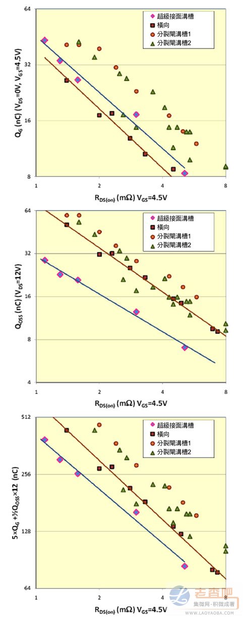 采用QOSS與QG加權組合作為性能指標的優點如圖3所示,其中QG、QOSS及其組合分別針對三個不同的30伏特功率MOSFET結構產生RDS(on)函數。趨勢線的斜率反映不同的FOM。請注意:由於數據來自於資料手冊,因此數值包含封裝電阻。由圖3可知,相較於超級接麵和分裂閘溝槽技術,橫向技術的QG更佳。由於超級接麵結構在元件閘極和連接源極的漏極遮罩電極間增加了CGS,因此QG值低於分裂閘技術。
