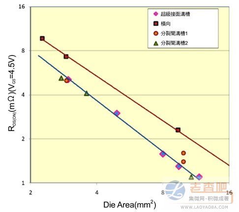 圖4 針對不同的功率MOSFET結構,晶片麵積與RDS(on)的關係。