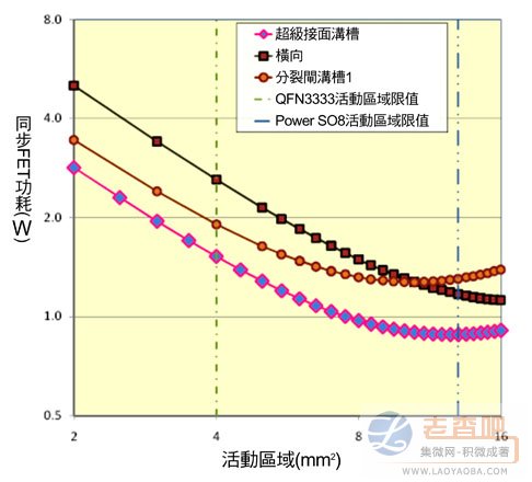 圖5 不同的功率MOSFET結構作為同步FET時,活動區域與功耗之間的關係。開關頻率為1MHz時,輸出電流為25安培。電壓由12伏特轉換為1.2伏特,閘極驅動電壓為5伏特。