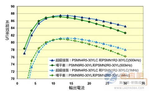 為展現超級接麵功率MOSFET結構的優點,可對係統效率進行測量,並將測量結果與超級接麵元件和晶片尺寸相似的場平衡結構元件做比較,工作頻率為500kHz和1MHz、電壓從12伏特轉換為1.2伏特(圖6)。當二者的晶片尺寸相同時,前者的導通狀態損耗優於後者。當工作頻率為500kHz和1MHz時,在30安培全負載和低負載條件下,係統效率均提高2%。超chao級ji接jie麵mian晶jing片pian尺chi寸cun無wu論lun大da小xiao,均jun有you可ke能neng出chu現xian下xia列lie情qing形xing,如ru重zhong負fu載zai條tiao件jian下xia的de效xiao率lv提ti升sheng會hui犧xi牲sheng輕qing負fu載zai效xiao率lv,而er輕qing負fu載zai條tiao件jian的de係xi統tong效xiao率lv提ti升sheng會hui犧xi牲sheng重zhong負fu載zai效xiao率lv。采cai用yongRDS(on)較高的控製FET可能會改善效率,因為QGD降低所帶來的益處大於RDS(on)升高所帶來的壞處。