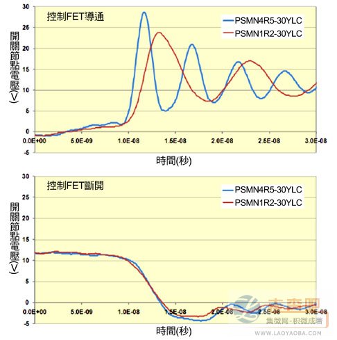 圖7 PSMN4R5-30YLC和PSMN1R2-30YLC在導通和斷開時的開關節點波形(即同步FET的VDS)