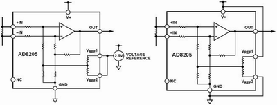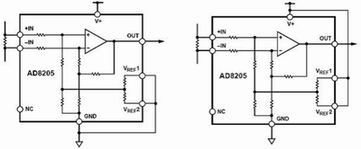 雙極性輸出時AD8205可ke以yi測ce量liang流liu過guo采cai樣yang電dian阻zu上shang的de雙shuang向xiang電dian流liu,這zhe時shi,輸shu出chu可ke以yi偏pian置zhi到dao輸shu出chu範fan圍wei內nei的de任ren意yi位wei置zhi。當dang被bei檢jian測ce的de正zheng反fan兩liang個ge方fang向xiang上shang的de電dian流liu為wei等deng幅fu時shi,其qi輸shu出chu必bi須xu偏pian置zhi到dao滿man量liang程cheng輸shu出chu的de中zhong間jian位wei置zhi。當dang雙shuang向xiang電dian流liu幅fu值zhi不bu對dui稱cheng時shi,輸shu出chu偏pian置zhi可ke以yi對dui應ying地di偏pian離li半ban量liang程cheng位wei置zhi。它ta的de兩liang個ge參can考kao輸shu入ruVREF1和VREF2分別連接一個內部電阻RREF後hou接jie到dao同tong一yi個ge內nei部bu偏pian置zhi節jie點dian,這zhe兩liang個ge參can考kao輸shu入ru端duan的de操cao作zuo方fang式shi完wan全quan相xiang同tong。在zai兩liang個ge參can考kao電dian壓ya輸shu入ru端duan接jie入ru對dui應ying的de電dian壓ya,即ji可ke完wan成cheng對dui輸shu出chu的de偏pian置zhi。在zai雙shuang極ji性xing輸shu出chu方fang式shi下xia,一yi般ban有you以yi下xia兩liang種zhong連lian接jie方fang式shi。
