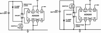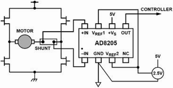 如圖5所示連接,AD8205在H橋馬達控製電路中作為控製回路的一部分,馬達和采樣電阻串連後放置在H橋的中間,通過檢測采樣電阻上的電壓,可以準確地測量馬達當前的電流及其方向。此時,AD8205的輸出被設定成外部參考雙向的方式,這樣它可以測量Hqiaokaiguandeshuangxiangdianliubingtongshijiancemadadeyunzhuanfangxiang。youyudibushiyigetebiewendingdecankaodianping,yidiweicankaojianghuidaozhiceliangdebuzhunquexing。yinci,zhezhongceshifanganyaobiyidizuoweicankaodianpingdeceshifangfahaodeduo。