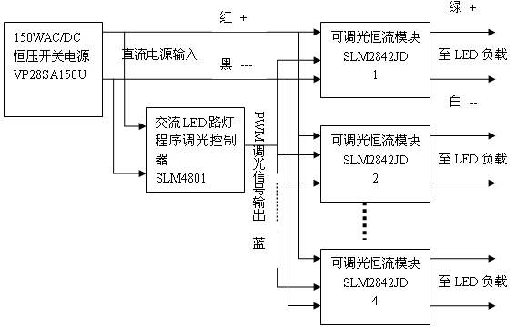 而且這種恒壓和恒流分開的方案的最大優點是可以插入程序調光係統。這樣可以進一步節約電能40%以上,這是任何直接恒流輸出方案所無法實現的。