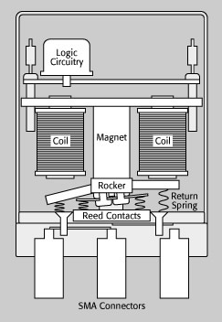 繼電器內的容性是限製開關的信號頻率的常見因素。繼電器的材料和物理特性決定了其構成的內部電容。比如,在超過40GHz的射頻和微波開關中,在機電繼電器中采用了特殊的接觸架構來獲得更好的性能。圖1顯示了一個典型的構造,共同端接位於兩個開關端接之間。所有信號的連接線路都是同軸線,來保證最佳的信號完整性(SI)。在這種情況下,連接器是SMA母頭。對於更加複雜的開關結構,共同端接被各個開關端接以放射狀圍繞。