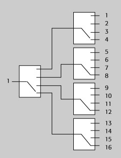 [page]層疊開關架構是多位置開關的一種替代形式。它采用多個繼電器將一個輸入連接到多個輸出。路徑長度(同時決定了相位延遲)是由信號經過的繼電器的數量決定的。