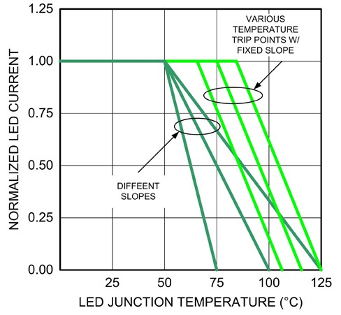 為防止組件遭受破壞或讓使用壽命縮短,必須進行熱能管理,且已有多種方法可以解決此問題。圖2為兩種不同的回折曲線,可在溫度上升時限製LED的電流流量。當接麵溫度保持在默認溫度範圍內時,就經由主要的控製回路作為電流調節;但(dan)當(dang)接(jie)麵(mian)溫(wen)度(du)超(chao)過(guo)默(mo)認(ren)範(fan)圍(wei)時(shi),就(jiu)會(hui)使(shi)用(yong)另(ling)一(yi)組(zu)控(kong)製(zhi)回(hui)路(lu)限(xian)製(zhi)電(dian)流(liu)大(da)小(xiao)。其(qi)中(zhong)接(jie)麵(mian)溫(wen)度(du)的(de)回(hui)折(zhe)點(dian)與(yu)驅(qu)動(dong)電(dian)流(liu)的(de)衰(shuai)減(jian)率(lv),均(jun)可(ke)依(yi)照(zhao)不(bu)同(tong)的(de)應(ying)用(yong)和(he)LED製造商的建議改變。