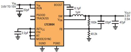 LTC3601 和 LTC3604 是高性能單片同步降壓型穩壓器,分別能提供高達 1.5A 和 2.5A 的電流。這兩款器件在 3.6V 至 15V 的寬輸入電壓範圍內工作,這樣的範圍涵蓋了手持式設備、PC 以及汽車中使用的電池化學組成。它們獨特的恒定頻率 / 受控接通時間架構提供 20ns 的最短接通時間,非常適用於需要高開關頻率和快速瞬態響應,同時能保持高效率的高降壓比應用。
