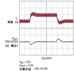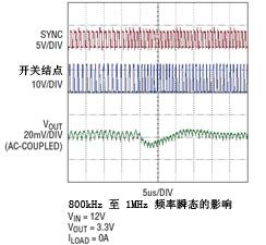 有些應用在工作時要求移動開關頻率,通常是為了避開相鄰無線接收器的幹擾。圖 3 顯示了甚至當 MODE/SYNC 引腳引入的同步頻率迅速變化時,輸出電壓的偏離也是很小。