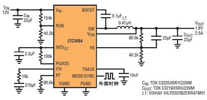 很多微處理器都需要 1.x 的低電壓軌,但是它們也用於需要高開關頻率的應用中,這類應用以高開關頻率保持采用外型很小的無源組件、並使關鍵頻段避開 RF 幹擾。問題是,要實現高降壓比和高開關頻率這不可思議的組合可能是難以捉摸的,因為需要這麼短的最短接通時間。圖 5 顯示 LTC3604 用在一個 4MHz、12V 至 1.8V 應用中的原理圖。這個應用要求的 38ns 接通時間遠大於 LTC3604 的 20ns 最短接通時間。