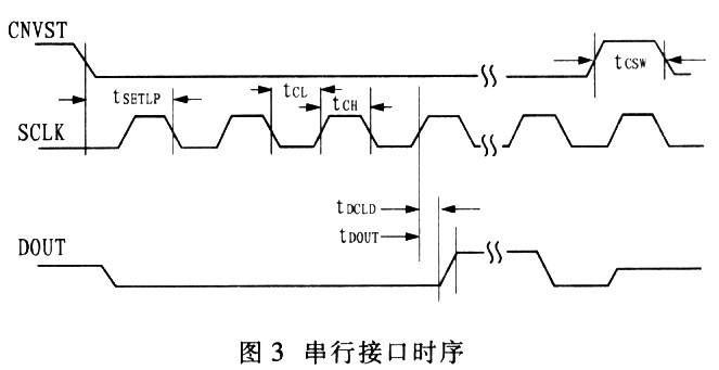 啟動轉換和讀數據操作由CNVST和SCLK端的數字輸入信號控製。圖3示出時序關係,描述串行接口的工作方式。