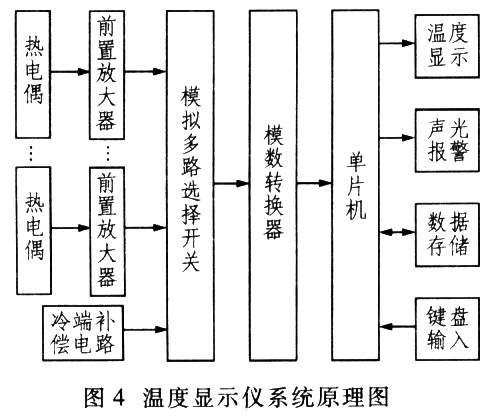 根據以上要求,筆者在溫度顯示儀的設計中以AT89C51型單片機為核心,采用MAX1224型12位串行A/D轉(zhuan)換(huan)器(qi)構(gou)成(cheng)采(cai)樣(yang)模(mo)塊(kuai)進(jin)行(xing)電(dian)路(lu)設(she)計(ji)。溫(wen)度(du)顯(xian)示(shi)儀(yi)的(de)主(zhu)要(yao)功(gong)能(neng)是(shi)完(wan)成(cheng)實(shi)時(shi)溫(wen)度(du)循(xun)環(huan)顯(xian)示(shi)功(gong)能(neng),它(ta)主(zhu)要(yao)用(yong)於(yu)工(gong)業(ye)現(xian)場(chang)中(zhong)的(de)加(jia)熱(re)爐(lu)及(ji)具(ju)有(you)較(jiao)高(gao)溫(wen)度(du)的(de)場(chang)合(he),它(ta)的(de)測(ce)溫(wen)範(fan)圍(wei)是(shi)O℃~1200℃,誤差要求小於±5℃。所設計的溫度顯示儀要求具有4路溫度檢測通道,由熱電偶采集現場溫度,並由冷端補償電路進行補償,再由前置放大電路將檢測到的微小信號轉變為ADC可轉換的信號。溫度顯示儀係統原理如圖4所示。