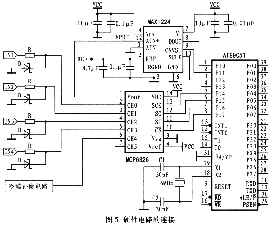 設計要求4路溫度檢測通道和l路冷端補償電路,所以本設計采用MCP6S26型6通道增益可編程放大器,該放大器特別適用於多路信號采集電路的設計,由於AT89C51單片機可以通過軟件對模擬信號電路進行控製,所以其適應性和靈活性大大提高。但是,由於AT89C51型單片機沒有3線製串行總線接口,它與MCP6S26進行3線製串行總線的連接時,要使用軟件來模擬3線製串行總線的操作,包括串行時鍾數據輸入和數據輸出。McP6S26與AT89C51的連接如圖5所示。圖中,P17模擬片選端CS,P14模擬時鍾輸入端SCK,P16模擬數據輸入端SI,P15模擬數據輸出端SO。