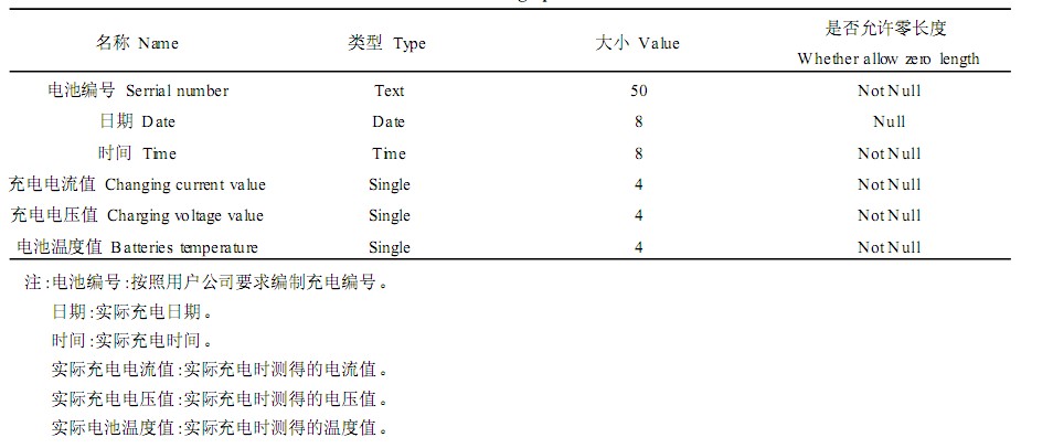 本係統設計了三個數據庫,用於標準充電曲線存儲、實際充電曲線存儲及分析結果存儲。使用VB6. 0提供的數據庫管理工具"可視化數據管理器"建立。其中實際充電曲線數據表如表1所示,數據庫的建立方便了對電池的查詢、分析,同時也方便了管理。