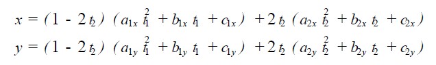式中a1x , b1x , c1x , a1y , b1y , c1y為Si 段曲線的係數,由Pi , Pi + 1 , Pi + 2三點控製,參變量為t1 ,在公共段範圍內t1∈[0. 5, 1 ];式中a2x , b2x , c2x , a2y , b2y , c2y為Si + 1段曲線的係數,由Pi + 1 , Pi + 2 , Pi + 3三點控製,參變量為t2 ,在公共段範圍內t2 ∈[0, 0. 5 ]。