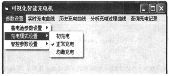 在(zai)參(can)數(shu)設(she)置(zhi)中(zhong)可(ke)以(yi)對(dui)框(kuang)圖(tu)中(zhong)所(suo)示(shi)的(de)條(tiao)目(mu)進(jin)行(xing)設(she)置(zhi),使(shi)得(de)該(gai)係(xi)統(tong)具(ju)有(you)很(hen)強(qiang)的(de)通(tong)用(yong)性(xing)。電(dian)動(dong)車(che)電(dian)池(chi)一(yi)般(ban)由(you)幾(ji)個(ge)單(dan)體(ti)組(zu)合(he)而(er)成(cheng),可(ke)以(yi)選(xuan)擇(ze)單(dan)體(ti)個(ge)數(shu)以(yi)確(que)定(ding)電(dian)池(chi)組(zu)的(de)電(dian)壓(ya)和(he)容(rong)量(liang)。該(gai)係(xi)統(tong)提(ti)供(gong)了(le)如(ru)框(kuang)圖(tu)所(suo)示(shi)的(de)三(san)種(zhong)充(chong)電(dian)模(mo)式(shi),一(yi)般(ban)新(xin)電(dian)池(chi)前(qian)五(wu)次(ci)充(chong)電(dian)要(yao)進(jin)行(xing)初(chu)充(chong)電(dian)以(yi)充(chong)分(fen)激(ji)活(huo)電(dian)解(jie)質(zhi),當(dang)單(dan)體(ti)電(dian)量(liang)不(bu)同(tong)時(shi)要(yao)均(jun)衡(heng)充(chong)電(dian),其(qi)餘(yu)時(shi)正(zheng)常(chang)充(chong)電(dian)。還(hai)可(ke)以(yi)按(an)照(zhao)需(xu)求(qiu)設(she)置(zhi)不(bu)同(tong)充(chong)電(dian)階(jie)段(duan)的(de)充(chong)電(dian)時(shi)間(jian),來(lai)滿(man)足(zu)各(ge)種(zhong)電(dian)池(chi)的(de)不(bu)同(tong)需(xu)求(qiu);實時充電曲線實時地顯示充電電流、電壓和電池溫度;曆史充電曲線可以顯示該電池組充電曆史;通過分析充電過程曲線即可了解電池存在的問題,如:蓄電池缺乏電解液、電解液比重不符合要求或蓄電池單體存在差異等,從而及時的對電池進行保養;該係統還提供了按日期或電池編號查詢、刪除充電記錄的數據庫功能,方便了操作;報警提示用來告知用戶充電的過壓、過流、過熱情況以及充電是否結束。