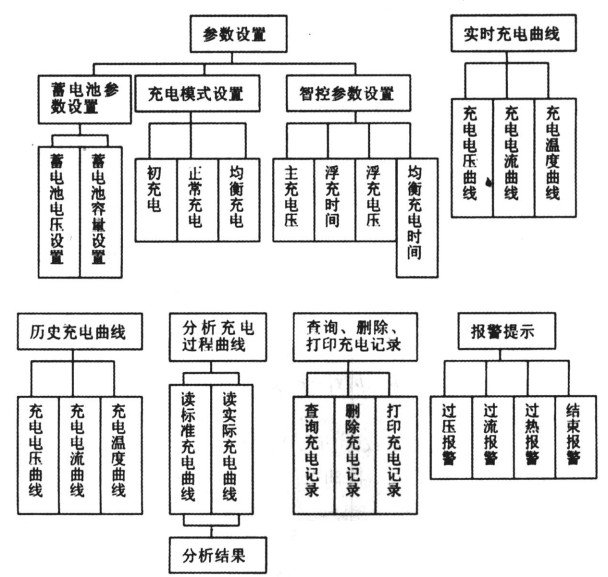 長期的用戶調研和質量服務告訴我們,上位機界麵開發的總體任務是:方(fang)便(bian)用(yong)戶(hu)設(she)置(zhi)和(he)修(xiu)正(zheng)充(chong)電(dian)參(can)數(shu),解(jie)決(jue)由(you)於(yu)鉛(qian)酸(suan)蓄(xu)電(dian)池(chi)的(de)使(shi)用(yong)及(ji)維(wei)護(hu)保(bao)養(yang)不(bu)到(dao)位(wei)造(zao)成(cheng)的(de)蓄(xu)電(dian)池(chi)早(zao)期(qi)報(bao)廢(fei)問(wen)題(ti)。為(wei)了(le)使(shi)用(yong)戶(hu)在(zai)使(shi)用(yong)過(guo)程(cheng)中(zhong)及(ji)時(shi)發(fa)現(xian)蓄(xu)電(dian)池(chi)存(cun)在(zai)的(de)問(wen)題(ti),從(cong)而(er)及(ji)時(shi)采(cai)取(qu)相(xiang)應(ying)的(de)補(bu)救(jiu)措(cuo)施(shi),為(wei)此(ci)我(wo)們(men)使(shi)用(yong)VB開發出了上位機軟件,它具有可視化、簡單易學、操作簡便的特點,並具備從充電參數設置、繪製充電曲線、存儲充電曲線、充電過程分析、充電記錄的查詢、刪除、打印到充電報警等全套充電分析功能,係統結構框圖如圖4.
