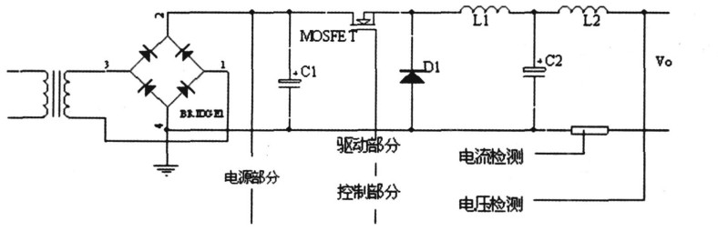 在主充電路中, 220 V電壓經變壓器降壓後,由整流器整流和大電容C1 平滑濾波,作為直流充電電源。MOSFET、二極管D1、電感L1 和電容C2 構成主充電路。在工作過程中, PWM控製信號的高電平脈衝出現,使MOSFET導通之後,電感L1 的電流不斷增大,電容C2 充電,主充變換器不斷存儲能量,同時通過電感L2 對電池充電,此時,續流二極管因反向偏置而截止。經過PWM高電平脈衝持續時間後, PWM信號變低,MOSFET截止,電感L1 中的電流減小, L1 兩端的感應電動勢使續流二極管導通, L1 中的存儲電流和電容C2 存儲電荷向電池充電。經過PWM信號的低電平持續時間後, PWM信號的又一高電平脈衝到來,再度使MOSFET導通,上述過程循環交替。電感L2 的作用是平滑充電電流.