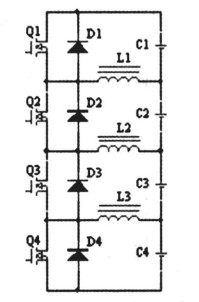 在均衡電路中,以4節電池為例,當對第二節電池均衡時,開啟MOS管Q2,蓄電池C2通過Q2給電感L1、L2充電,然後關斷MOS管Q2,則電感L1中的電流通過二極管D1回饋給蓄電池C1,電感L2中的電流通過二極管D3和D4回饋給蓄電池C3和C4,以達到各個單體均衡的效果。