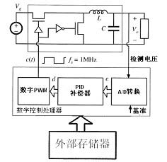 隨(sui)著(zhe)數(shu)字(zi)芯(xin)片(pian)和(he)電(dian)源(yuan)技(ji)術(shu)的(de)發(fa)展(zhan),現(xian)在(zai)出(chu)現(xian)了(le)為(wei)電(dian)源(yuan)控(kong)製(zhi)而(er)開(kai)發(fa)出(chu)來(lai)的(de)控(kong)製(zhi)處(chu)理(li)器(qi),它(ta)不(bu)同(tong)於(yu)數(shu)字(zi)芯(xin)片(pian)的(de)中(zhong)央(yang)處(chu)理(li)器(qi)。控(kong)製(zhi)處(chu)理(li)器(qi)主(zhu)要(yao)由(you)高(gao)速(su)AD轉換器,數字PID補償器和數字PWM輸出三部分組成。反饋環路的控製由它來完成,中央處理器作為管理模塊應用在電源上。其原理圖如圖3所示: