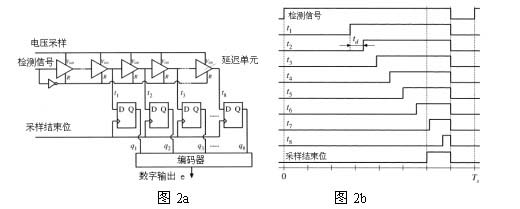 [page]控製處理器由高速A/D轉換器,數字PID補償器和數字DPWM輸出組成。外部存儲器記錄了控製處理器的相關程序。高速A/D轉換器是基於CMOS的傳輸延遲時間td 影響輸入電壓VDD的原理做成的,VDD電壓和傳輸時間是成近似的反比例關係,即VDD越大,信號傳輸延遲時間越小。如圖2所示,以CMOS的輸入電壓VDD作位采樣電壓的輸入口,各信號之間的傳輸時間延時td受采樣電壓VDD影響。第四分之三個采樣周期過後采樣結束位產生高電平,開始記錄q1到q8的輸出,把得到的結果送入編碼器得到數字輸出e,完成A/D轉換。如圖2b所示,數字采樣值為11111100.VDD越大,td越小得到的采樣值越大。