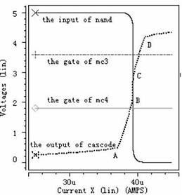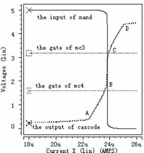 從虛線即cascode結構的輸出電壓波形可以看出,電流極限比較器的工作過程分為五個階段,第一階段:檢測電流從0慢慢上升到A,在此過程中,由於檢測電流遠小於極限電流,強迫Mc3和Mc4都工作於線性區。第二階段:檢測電流從A上升到B,cascode結構的輸出電壓也隨著上升,使Mc4工作於飽和區,Mc3工作於線性區。但是Mc4隻是剛剛進入飽和區,還受溝道調製因素影響,這可從圖中很清析地看出當cascode結構的輸出電壓隨檢測電流上升時,Mc4中電流慢慢接近所設定的極限電流。第三階段:檢測電流從B上升到C,此時檢測電流已上升到所設定的極限電流,Mc3和Mc4都工作於飽和區,同時cascode結構的輸出電壓也上升到後麵反相器的中點電壓,經過後續控製電路關斷功率管。第四階段:檢測電流從C上升到D,此時檢測電流大於所設定的極限電流,迫使Mc5工作於線性區,雖Mc6還工作於飽和區,但受溝道調製因素影響,另外Mc3和Mc4工作於飽和區。第五階段:檢測電流從D繼續往上升,迫使Mc5和Mc6都工作於線性區,Mc3和Mc4工作於飽和區。從圖4中可以看出,當檢測電流達到4.1μA時,關斷功率管,滿足係統要求。圖5--圖7的工作情況與圖4類似,圖5設定極限電流為16μA,可以看出當檢測電流達到15.97μA時,關斷功率管。圖6設定極限電流為24μA,可以看出當檢測電流達到23.82μA時,關斷功率管。圖7設定極限電流為40μA,可以看出當檢測電流達到39.6μA時,關斷功率管。