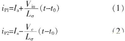 (2)工作模態2[t0-t2] 如圖3(b)所示,t1時刻,D2、D3中反向恢複電流達到最大值,D5、D6導通,D2、D3達到瞬時反向電壓Vo,緩衝電容C1(C2)和副邊漏感Lo’開始諧振。Vin、VC分別加在原邊繞組Np1、Np2上,ip1正向增大,ip2減小並反向增大。
