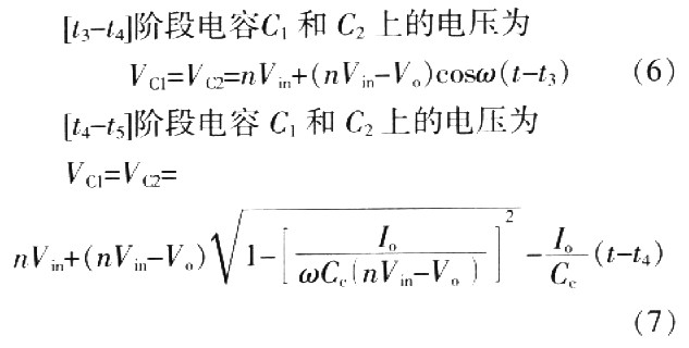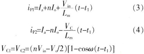 兩端電壓從零開始諧振增大,在半個諧振周期後達到最大值VC1max=VC2max=2nVin-Vo,此時模態2結束。模態2中,VD5=VD6=0,VD7=Vo。二極管D2、D3兩端反向電壓從V0逐漸增大VD2=VD3=4nVin-V0。
