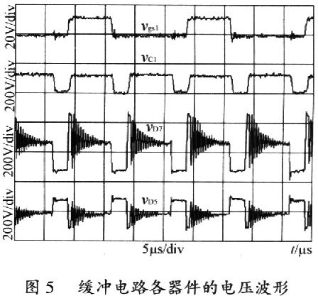 圖5給出了緩衝電路各器件的電壓波形,波形從上往下依次是vgsl、vC1、vD7、vD5。當任何一個開關管開通時,緩衝電容充電,抑製了關斷整流管的電壓尖峰;當任何一個開關管關斷時,緩衝電容給負載釋放能量,然後4個整流二極管均導通續流。整流二極管和緩衝二極管上振蕩周期均為