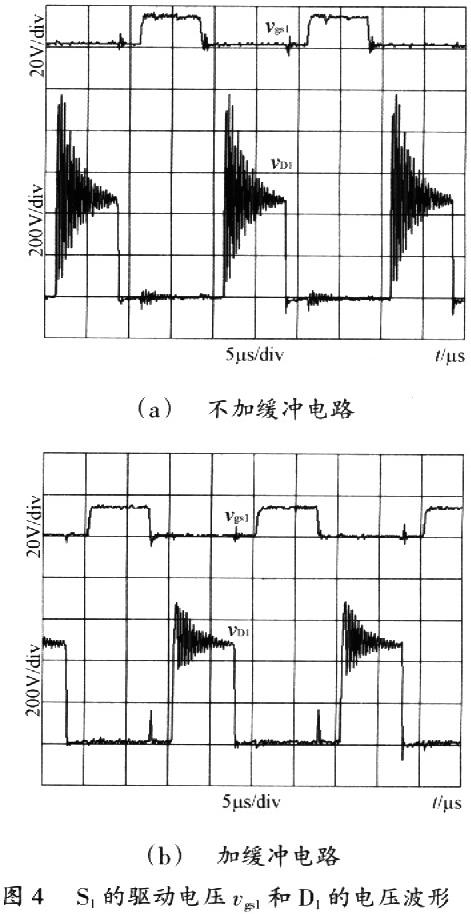 為了驗證無損緩衝電路的尖峰吸收過程,研製了一台1 000W的實驗樣機。實驗參數確定為:Vin=18V~32V,Vo=360V,n=9.5,C=33.3μF,L1=L2=320μH,C1=C2=4.7nF,C3=C4=470μF,Ts=20μs。S1和S2為FQAl40N10;D1、D2、D3、D4采用CSD10120,D5、D6、D7采用DSE112-06。