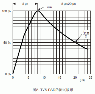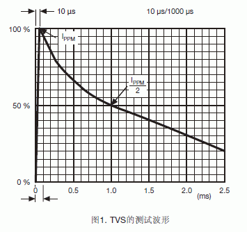TVS的額定功率是在一定測試或應用條件下吸收浪湧的能力。10μs/1000μs脈衝波形的工業標準測試條件(Bellcore 1089標準)如圖1所示。這個測試條件不同於8μs/20μs脈衝波形的TVS瞬態電壓吸收能力測試條件,如圖2所示。