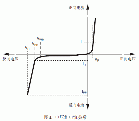 在特定的峰值脈衝電流定額下,TVS上會出現鉗位電壓。TVS的擊穿電壓在非常小的電流下測得(例如1mA或10mA),它不同於應用條件下的實際雪崩電壓。因此,半導體製造商所標注的是在大電流下的典型或最大擊穿電壓。
