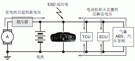 電子控製單元、傳感器和信息娛樂係統等汽車電子設備連接在一根電源線上(圖4)。這些電子產品的電源是電池和交流發電機,這兩種電源的輸出電壓都不穩定,容易受溫度、工作狀態和其他條件影響。此外,使用燃油噴射係統、閥、電機、電氣和水解控製器等電磁線圈負載的汽車係統,會把ESD、尖峰噪聲和其他類型的瞬態和浪湧電壓引入到電源和信號線上。