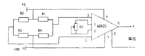 我們選用的高精度低噪聲儀用放大器AD620,可以用在傳感器輸出信號小的放大器中,如光電池傳感器、應變片傳感器以及壓力傳感器等。由於它具有低噪聲、增益精度高、增益溫度係數小和高線性度等優良性能。用於此係統中是非常理想的。AD620是一種隻用一個外部電阻就能設置放大倍數為1-1000的儀表放大器,具有良好的直流性能和交流性能,AD620的體積小、功耗低成為應用在壓力傳感器中的重要因素,傳感器信號放大電路如圖5所示。
