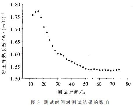 測試時間對測試結果的影響如圖3所示。由圖3可以看出,測試時間不同,計算出的鑽孔周圍地下岩土的平均導熱係數也不同。當測試時間達到約50小時後,測出的導熱係數趨於穩定,維持在1.530~1.538 W/m℃的範圍之間。通常測試時間可以選取60小時左右,這樣既可以保證獲得正確的導熱係數,又可以避免測試時間過長。