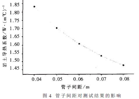 維持其它條件不變,隻改變導管上升管與下降管之間的間距,其對岩土導熱係數的影響見圖4。當管間距變化約為0.0lm時.計算出的導熱係數變化約為4~8%。由圖中可以看出,間距越大,計算出的導熱係數越小:這是由於間距越大,鑽孔內的熱阻越小,在總熱阻不變的情況下.周圍岩土的導熱熱阻大。即導熱係數小。因此如何確定管於間距是設計地源熱泵係統中值得認真探討的問題。