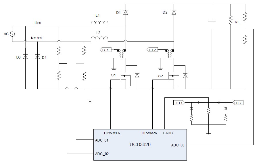 大多數現今的數字電源控製器(例如:TI的融合數字電源控製器UCD30xx)都提供了許多的集成電源控製外設和一個電源管理內核,例如:數字環路補償器,快速模數轉換器(ADC),具有內置停滯時間的高分辨率數字脈寬調製器(DPWM),以及低功耗微控製器等。它們都對無橋PFC等複雜高性能電源設計具有好處。